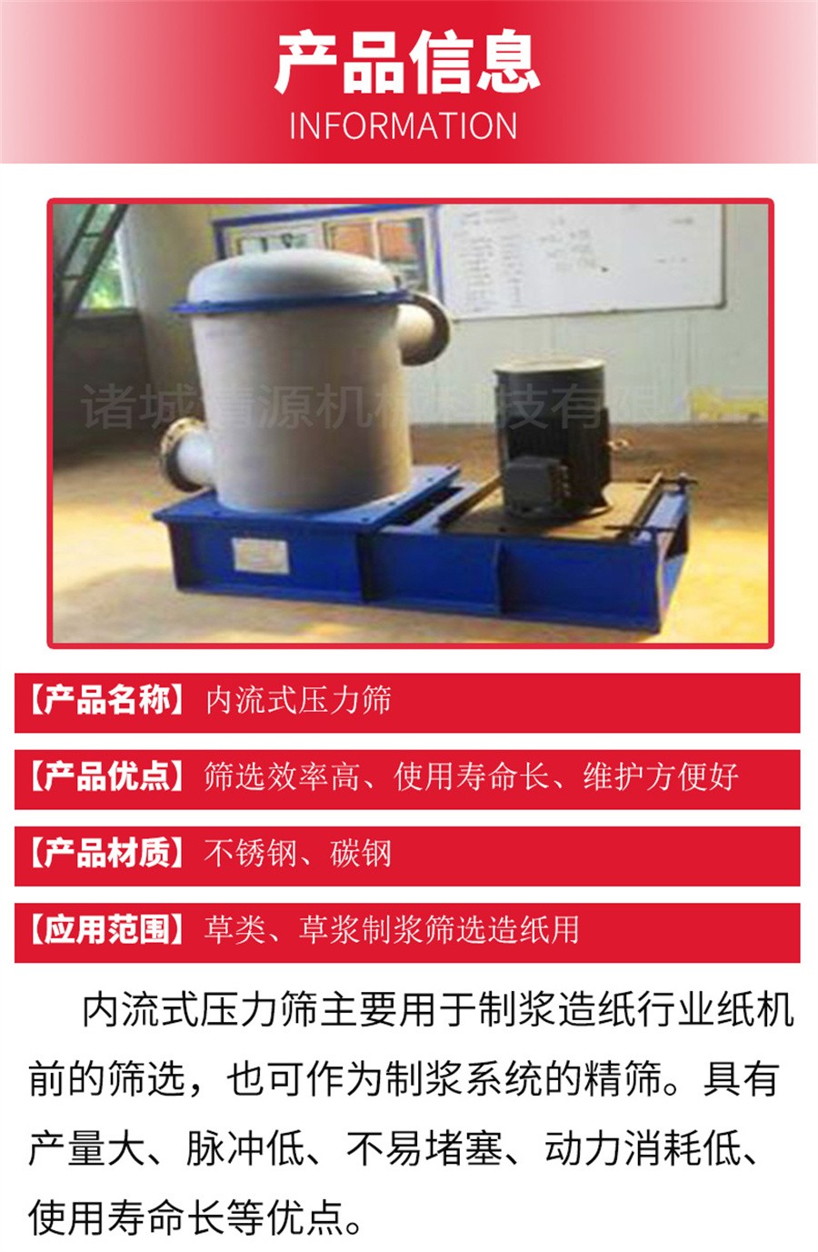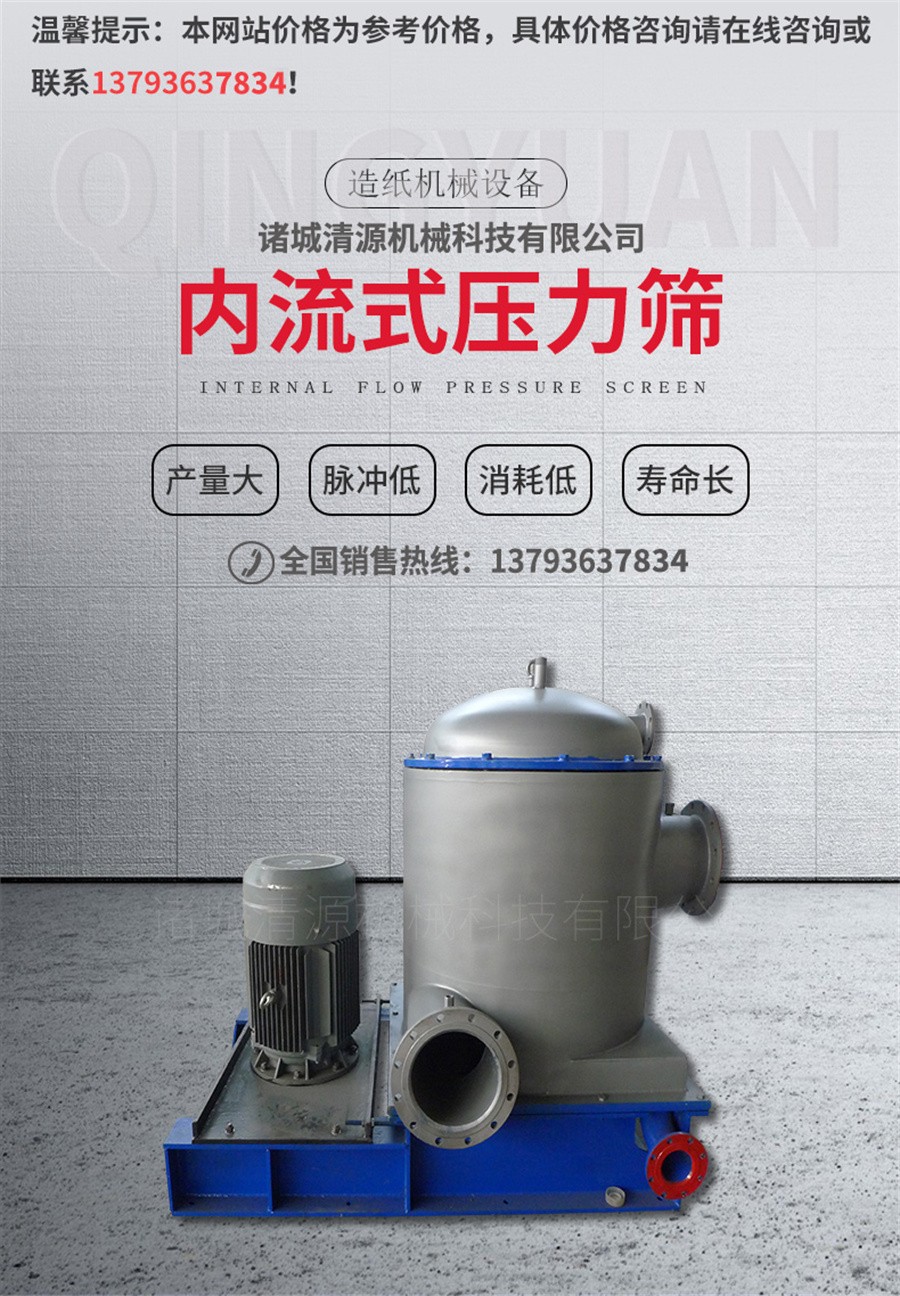 ZNL內流式壓力篩主要用于制漿造紙行業紙機前的篩選,也可作為制漿系統的精篩。具有產量大、脈沖低、不易堵塞、動力消耗低、使用壽命長等優點。