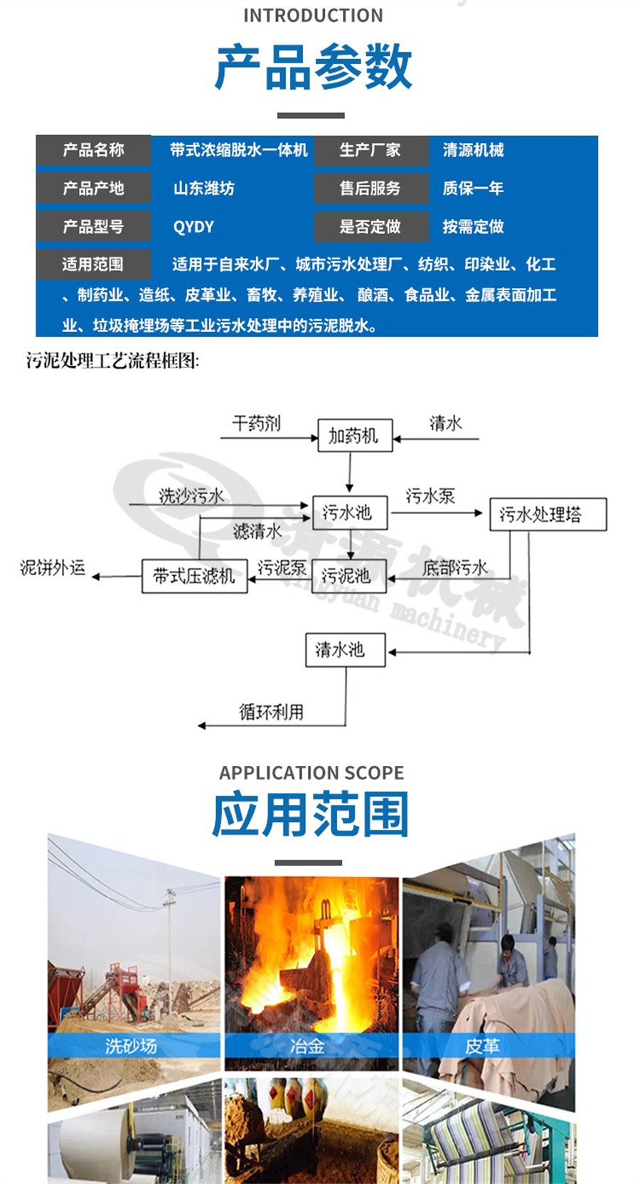 帶式濃縮脫水一體機適用于自來水廠、城市污水處理廠、紡織、印染業、化工、制藥業、造紙、皮革業、畜牧、養殖業、 釀酒、食品業、金屬表面加工業、垃圾掩埋場等工業污水處理中的污泥脫水。